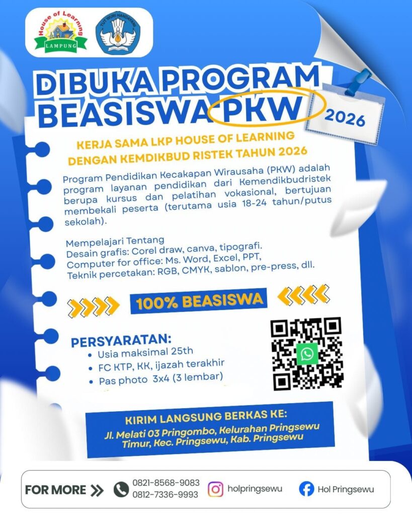 Program PKW 2026 ini merupakan kerjasama antara LKP House of Learning Pringsewu dengan Kementerian Pendidikan, Kebudayaan, Riset, dan Teknologi (Kemdikbud Ristek). Program ini bertujuan untuk memberikan pembekalan vokasional bagi peserta, terutama usia 18-24 tahun, dalam rangka menciptakan wirausaha-wirausaha baru yang handal di Lampung.