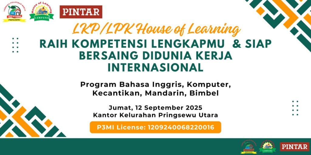 Pringsewu, 12 September 2025 – LKP House of Learning (HOL) Pringsewu kembali menunjukkan komitmennya dalam mencetak generasi muda yang kompeten dan siap bersaing di dunia kerja internasional. Bertempat di Kantor Kelurahan Pringsewu Utara, sosialisasi pendidikan vokasi dengan tema “Raih Kompetensi Lengkapmu dan Siap Bersaing di Dunia Kerja Internasional” berlangsung dengan meriah dan penuh antusiasme.